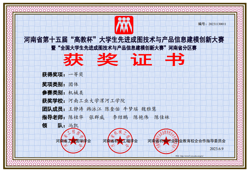 5月27日,由河南省工程图学学会、河南省机械工程学会、河南省机械行业职业教育校企合作指导委员会联合举办的河南省第十五届“高教杯”老员工先进成图技术创新大赛隆重举行,漯河工公司机电工程系荣获团体一等奖。
