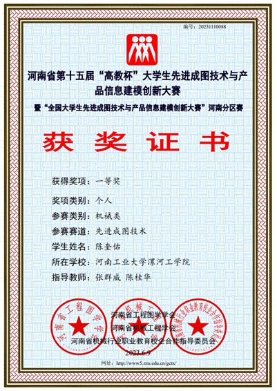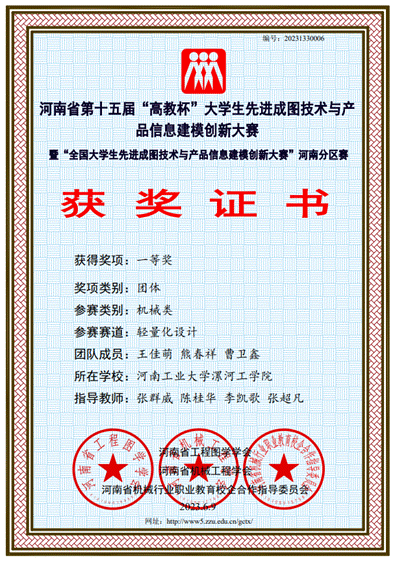 今年河南省省赛参赛人数多达1600余人,59支队伍,其中机械类1001人,参赛人数创历史新高。机电工程系通过校赛多次选拔、集中培训,最终选定王静涛、陈奎佑等11名同学代表公司参赛。在团队老师的悉心指导和同学们的不懈努力下,最终获得成图赛道一等奖3项、二等奖2项、三等奖2项、轻量化设计赛道一等奖的优异成绩。