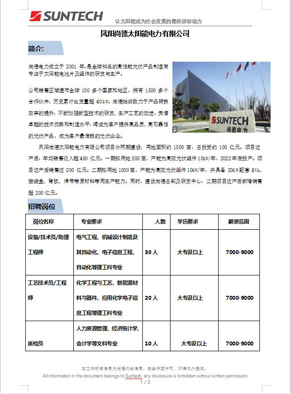 凤阳尚德太阳电力有限公司招聘简章