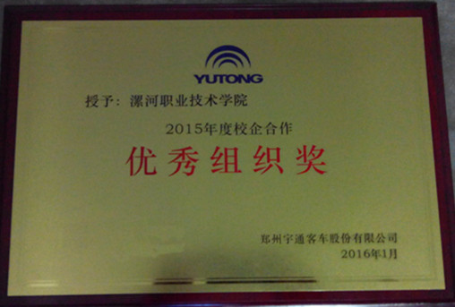 2016年1月8日下午,宇通客车股份有限公司2015年度校企合作优秀合作院校颁奖仪式在宇通公司隆重举行,由于双方融洽的合作关系,机电工程系荣获宇通客车2015年度校企合作优秀组织奖,部分在公司就业员工荣获优秀员工等奖项。