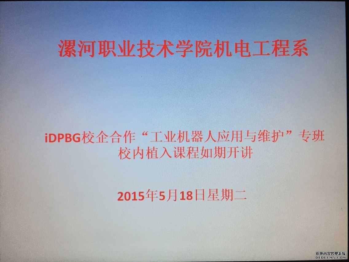 为深化校企合作,机电工程系和郑州富士康集团经过近一年的协商,于2015年3月27日举行签字授牌仪式,正式成立了郑州富士康集团漯河职院iDPBG校企专班。