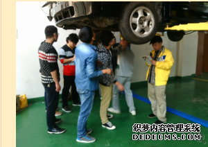 活动开始,老师按照员工各自情况对同学们进行分组,之后,由组长制定计划,各组成员严格按照计划实施。具体实施过程分四步进行:①举升车辆;②汽车底盘检查;③整理工具;④活动总结。